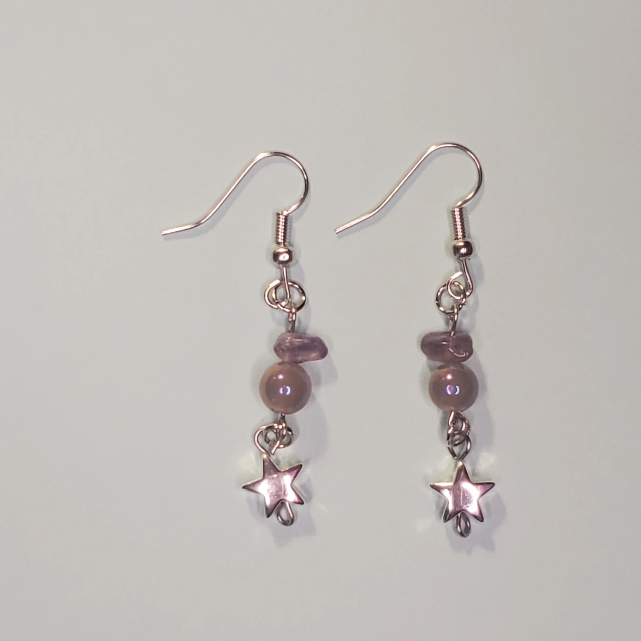 This handmade purple and green beaded silver star pendant necklace features a variety of glass and acrylic beads and gemstones. This necklace boasts beautiful double layer chain ending with smaller stars.
